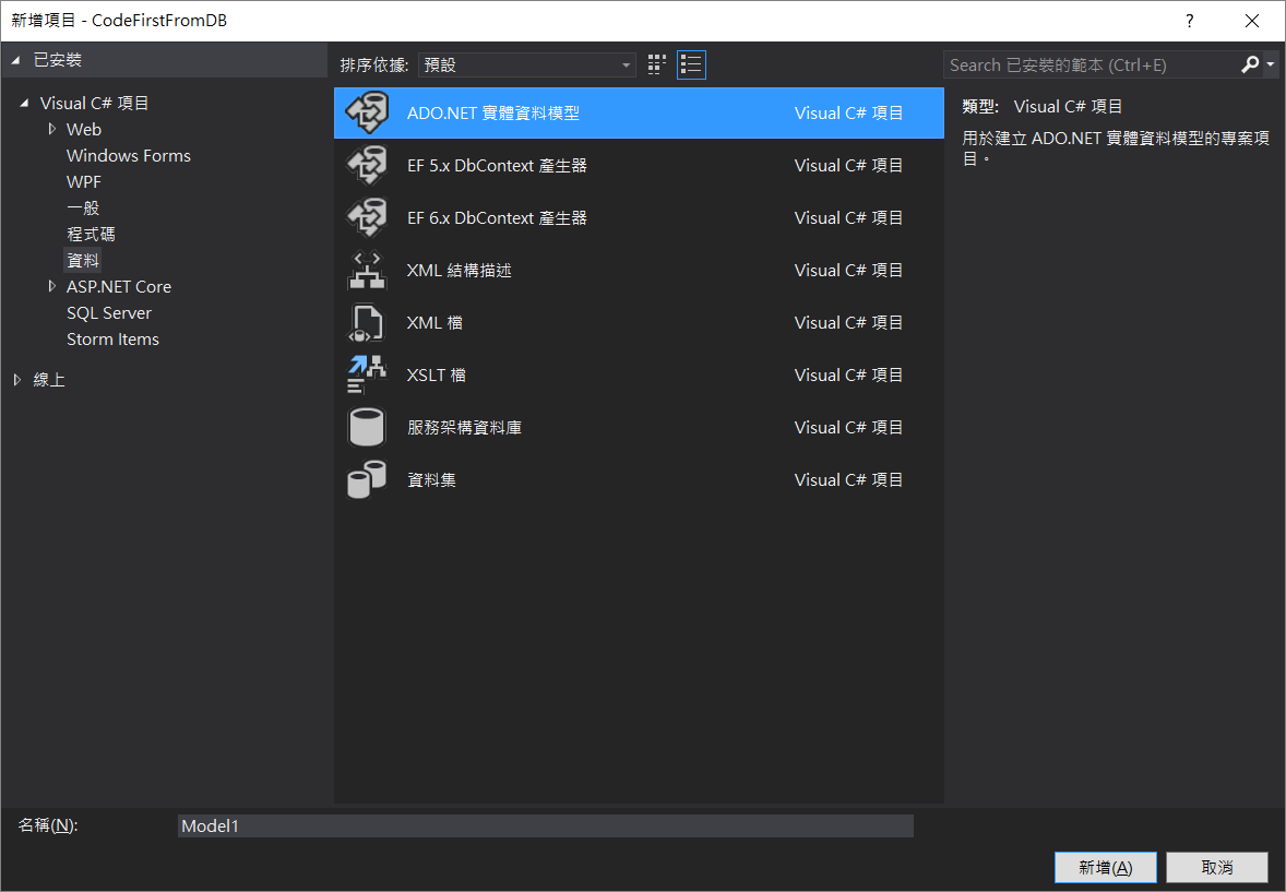 1. 首先在專案中加入新項目,選擇「ADO.NET 實體資料模型」