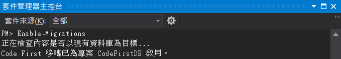 7. 在命令視窗中鍵入 Enable-Migrations 接著工具就會自動將移轉啟用與產生 Migrations 目錄