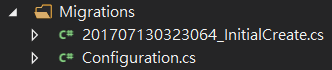 8. 接著在鍵入 Add-Migration InitialCreate -IgnoreChanges 其中 InitialCreate 是自行命名的名稱(建議是有意義的命名,如敘述這次的操作內容),送出指令後會產生出一筆含此命名的 Class 檔案,此檔案內容是處理接著要變更資料庫內容的 Migration 檔案,而 -IgnoreChanges 部分則是註記這次產生出的 Migration 檔案,要忽略 Model 的異動。會在這裡加上 -IgnoreChanges 是因為這是第一次從 Database 轉成 Code First Model,在我的測試遇到的狀況是,透過「ADO.NET 實體資料模型」產生的僅是既有資料庫轉成的 Model,也就是只是一份對這個資料庫的敘述檔案,所以若是沒加 -IgnoreChanges,這個工具就會當作這是第一次使用 Code First Model 來建置一個全新的資料庫,而生成寫有 Create Table 等方法的 Migration 檔案,所以這邊才需要註記忽略變更