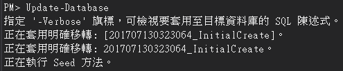 9. 在命令工具中鍵入 Update-Database 更新資料庫,雖然上的步驟產生的 Migration 沒有執行任何動作,但每當產生出一筆 Migration 即需要執行一次 Update-Database,否則下次產生 Migration 時,會提示尚未處理前次的 Migration 操作,而阻止你建立新的 Migration