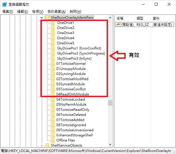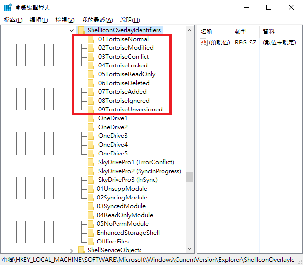 要修改OverlayIcon的設定是在Regedit裡,要修改的路徑是