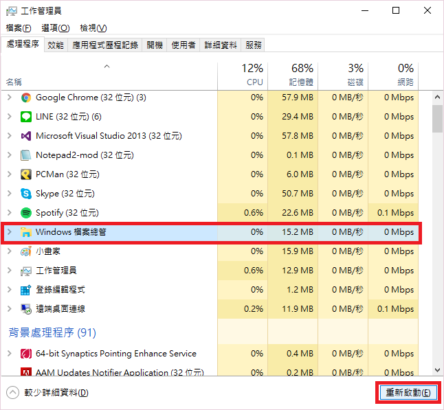 改完後,到工作管理員將Windows 檔案總管重新啟動,如下圖: