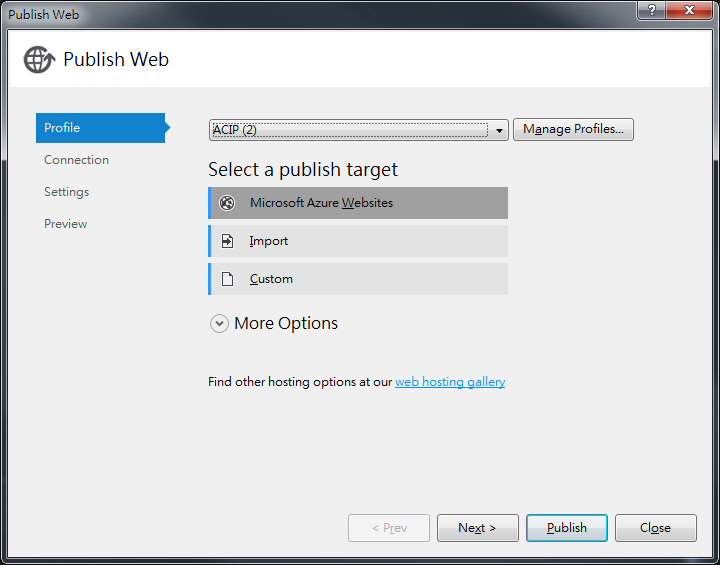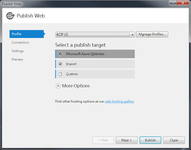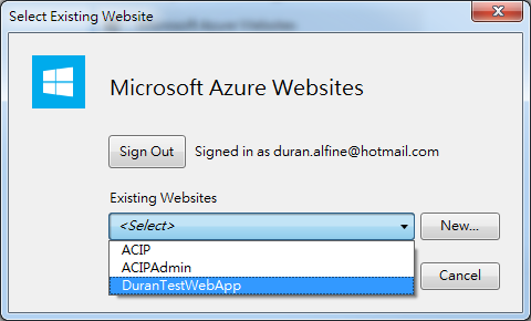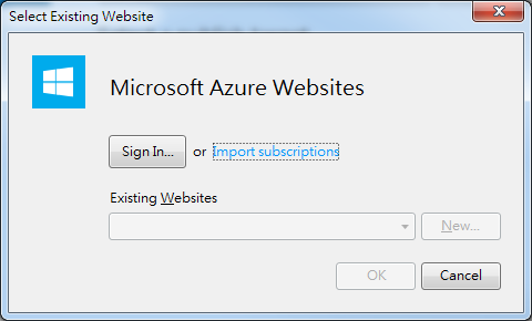 Step 8. 點選"Microsoft Azure Websites"進行登入(你也可以點選"匯入"匯入發佈設定檔)