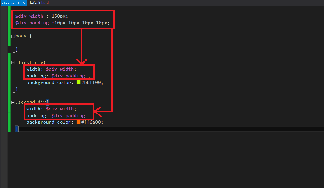 我們設定了$div-width 和 $div-padding,提供給.first-div與.second-div使用。