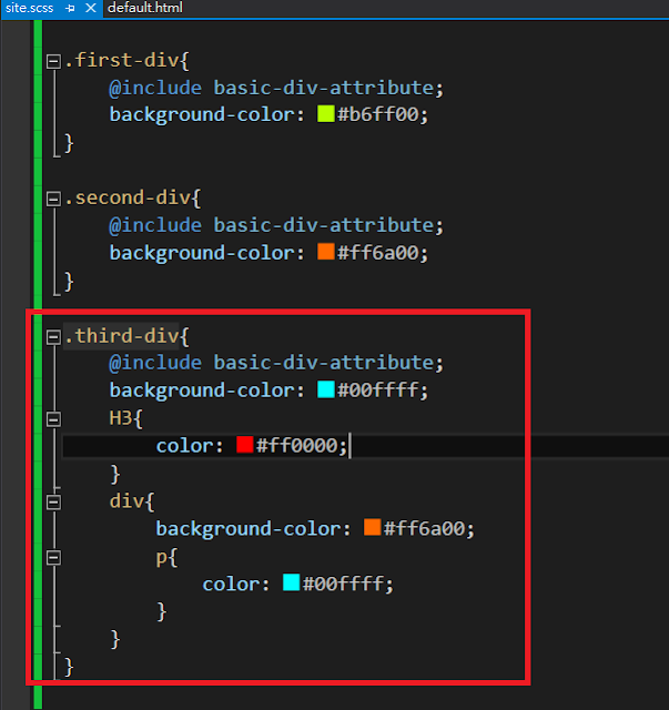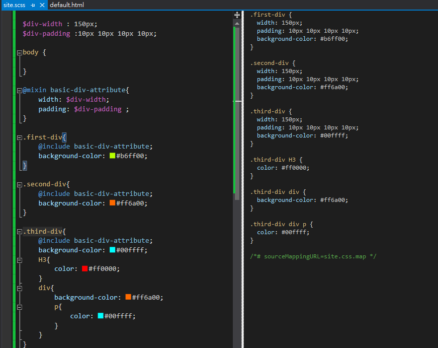 After you save scss file, Variable, Mixin, and Nest structur will be compiled to .css and min.css.