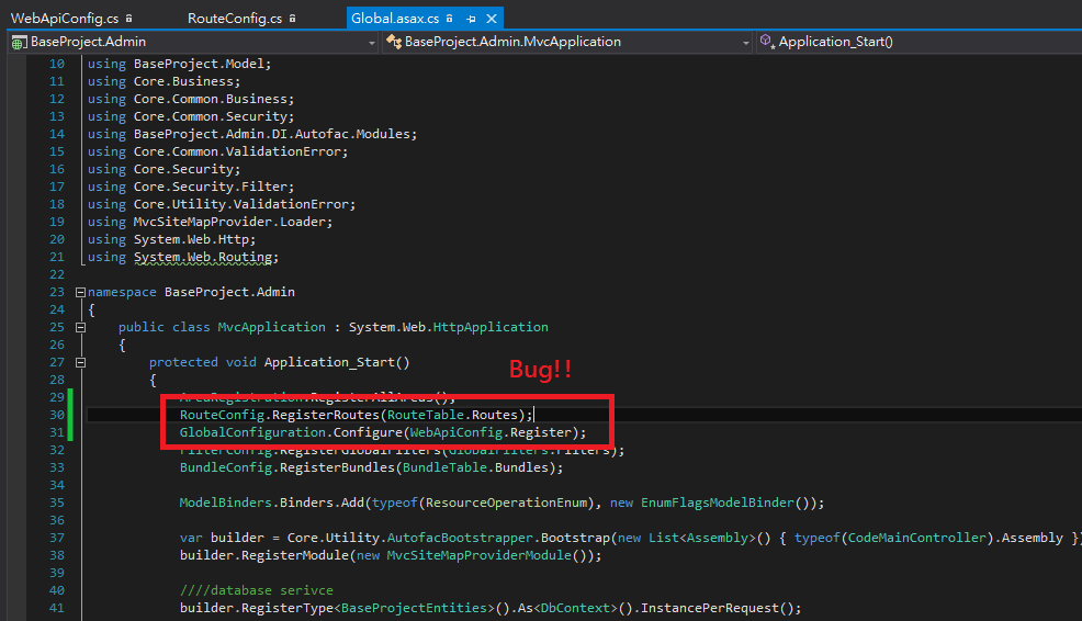 但是MapHttpAttributeRoutes()寫在WebApiConfig.cs中,但WebApiConfig.cs卻在RouteConfig.cs後面。