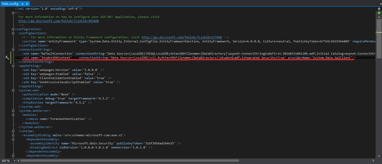 <add name="StudentDbContext" connectionString="Data Source=(LocalDB)\v11.0;AttachDbFilename=|DataDirectory|\Student.mdf;Integrated Security=True" providerName="System.Data.SqlClient" />