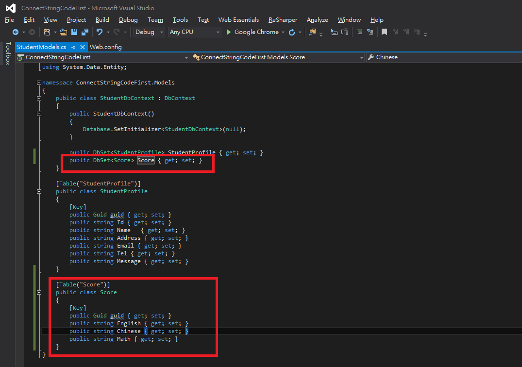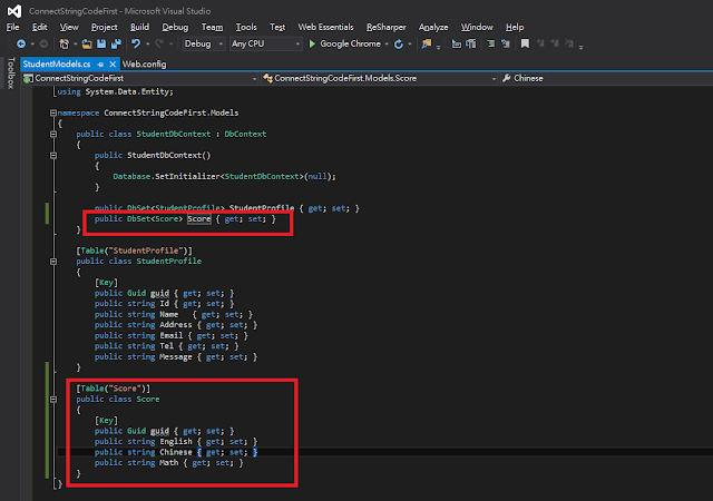 Step 1.我們新增一個cs檔案,名字為StudentModels.cs於Models資料夾下,這是一個DbContext