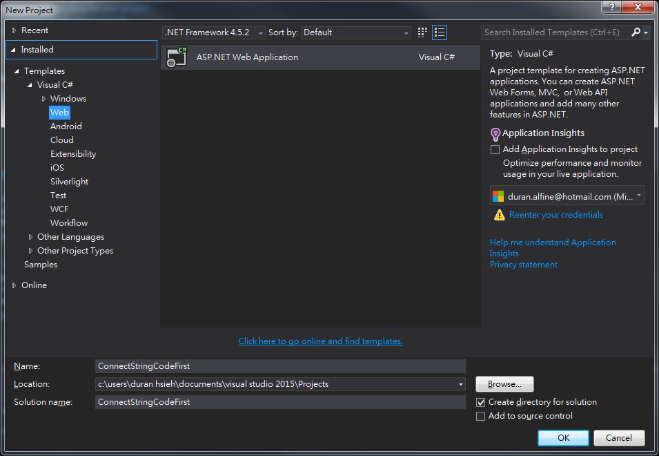 選擇web -> ASP.Net Web Application, 輸入專案名稱,點確定。