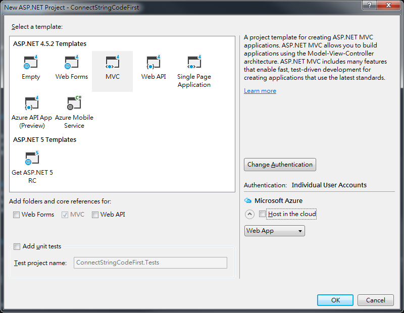 Step 2. 選擇MVC專案,點選確定,即建立一個範本專案。