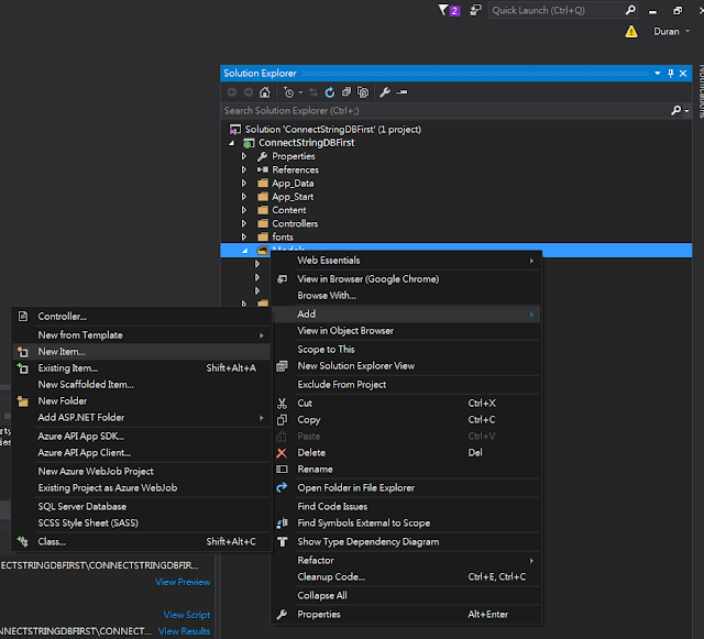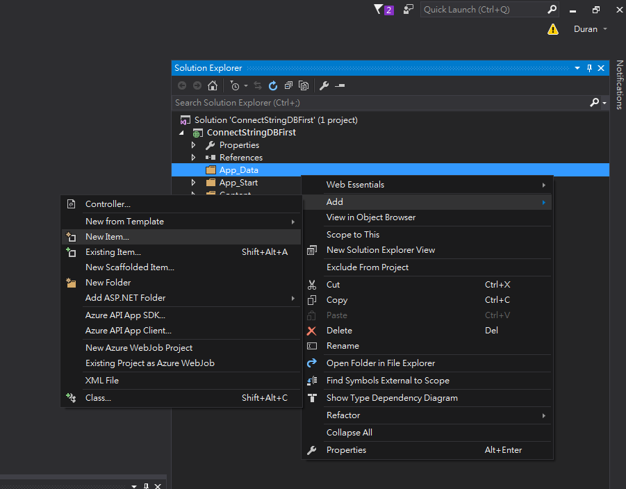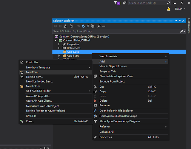Step 1. 右鍵點選App_Data資料夾,點選新增(Add) -> 新增項目(New Item)
