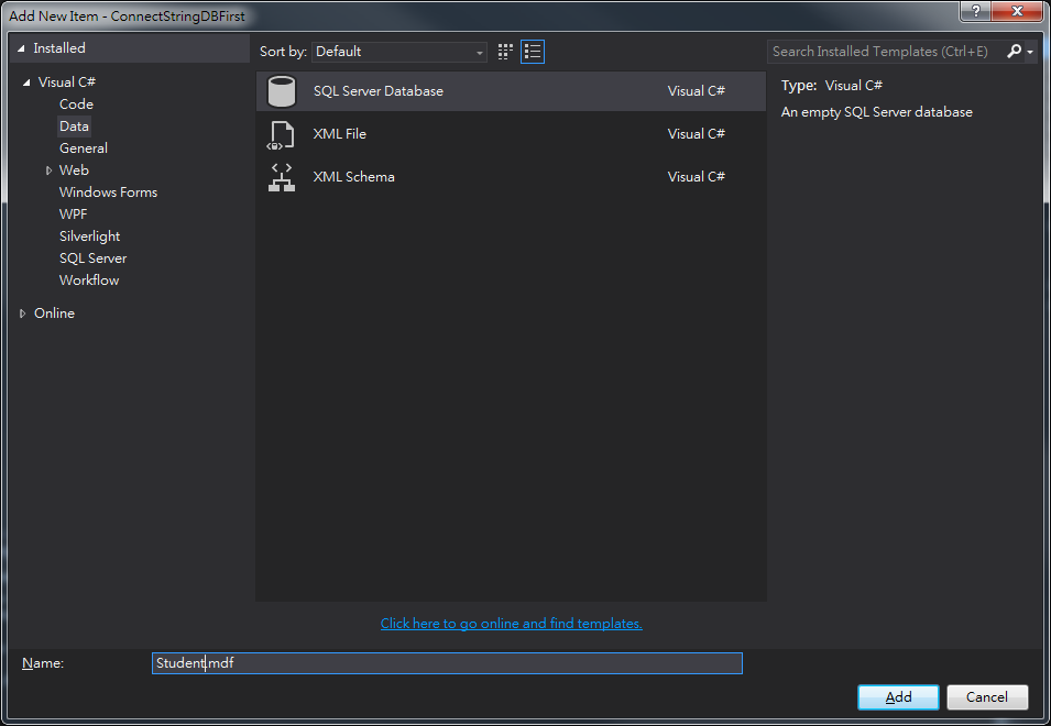Step 2. 選擇資料(Data) -> SQL Server Database,名稱輸入Student.mdf