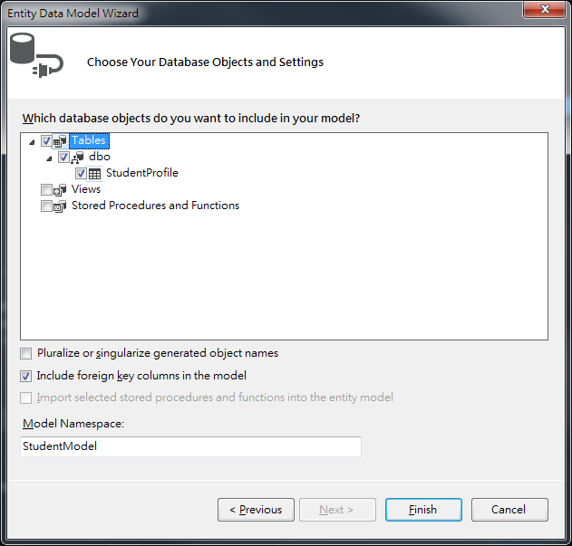 Step 5. 選擇欲建立的資料表(table)、檢視表(View)或預存程序(Stored procedures and function)