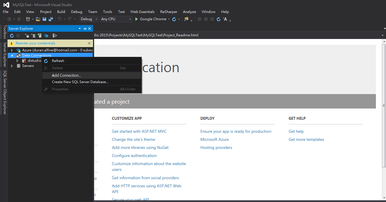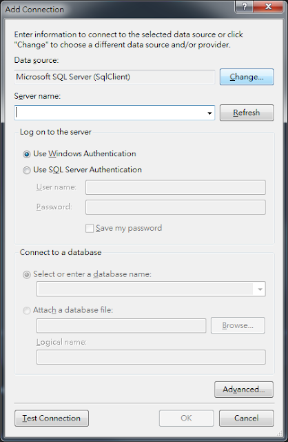 Step 7. 點選 View -> Sever Explorer, 右鍵點選 Data connections, 點選Add connection..