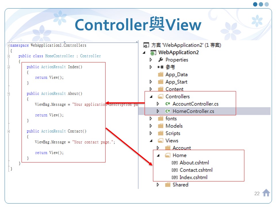 Controller程式的命名規則,後面皆需要加上 Controller,如: HomeController