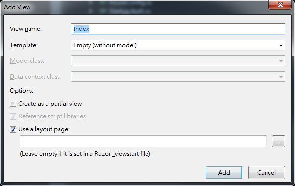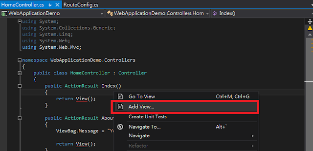當你寫好一個Action,你可以右鍵點選這個Action,選擇Add View,Visual Studio會自動