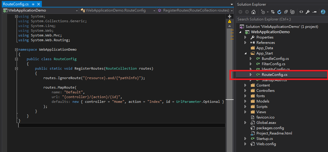 我們可以在專案下找到 App_Start\RouteConfig.cs 這個檔案。