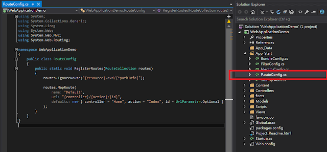 routes.IgnoreRoute("{resource}.axd/{*pathInfo}"); routes.MapRoute( name: "Default", url: "{controller}/{action}/{id}", defaults: new { controller = "Home", action = "Index", id = UrlParameter.Optional } );