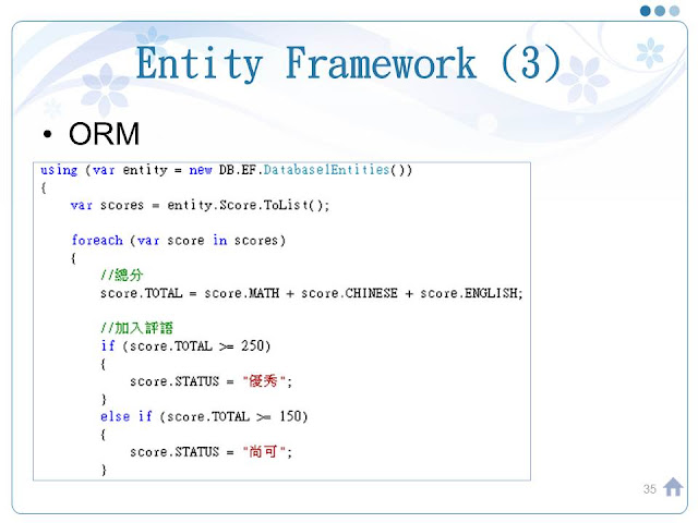 使用類似 SQL 的 linq 語法進行操作,取得對應的資料庫物件後,直接對物件內容進行操作。