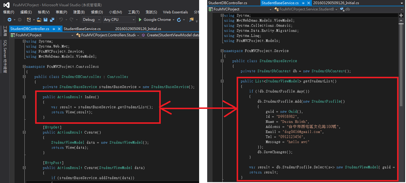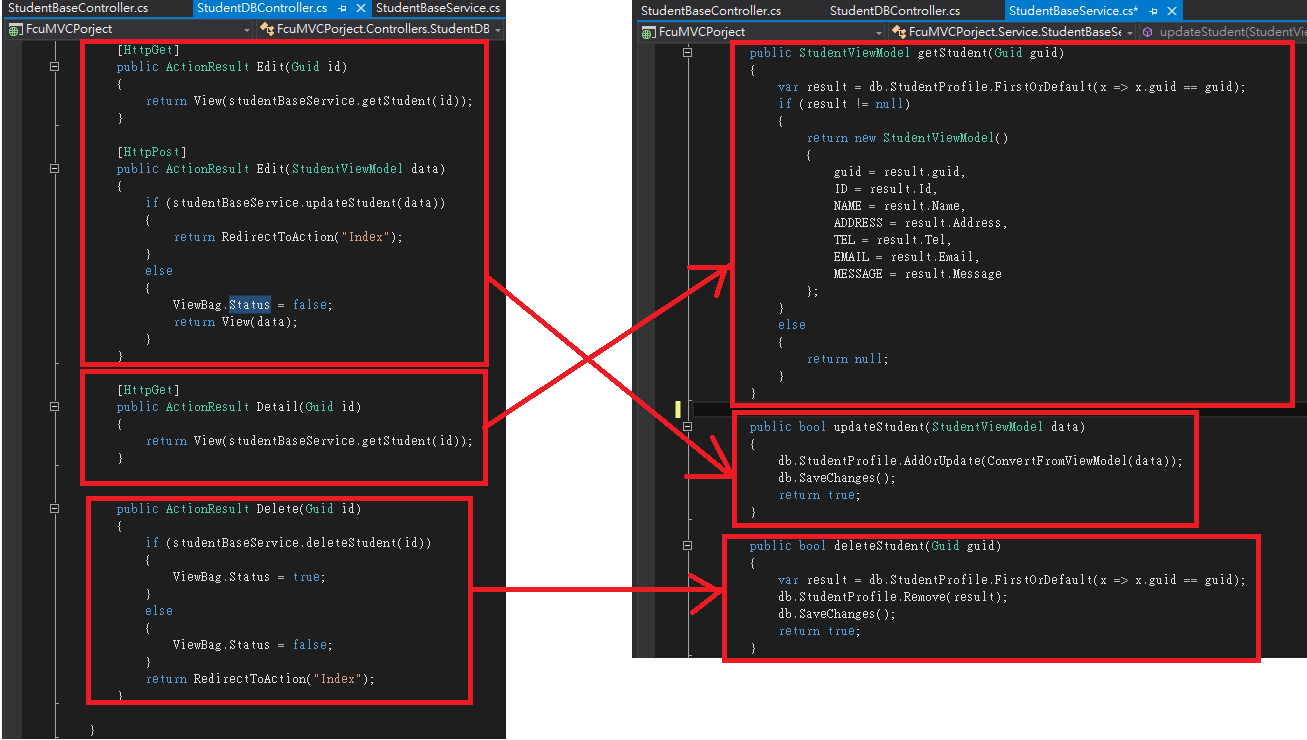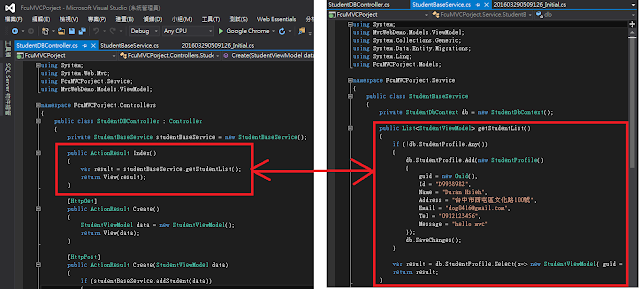 此範例使用的 StudentDBController 包含五種Action