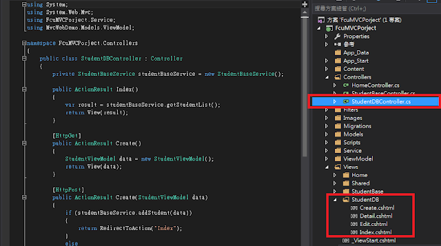 - Controller:包含新增、修改、刪除、檢視與條列的 Controller 與 Action 。