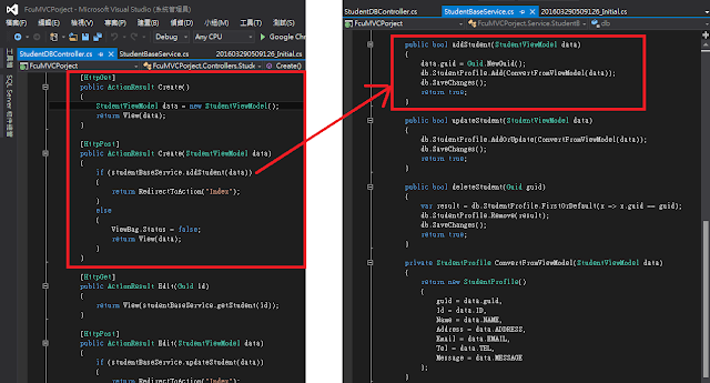 Create action 主要實作 ViewModel 對應資料物件 與 使用資料操作建立資料,primary key為