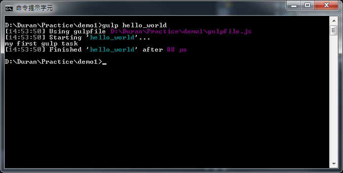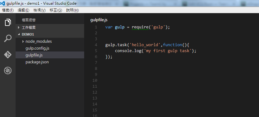 使用 gulp.task 新增工作事項,內容使用console.log印出訊息。
