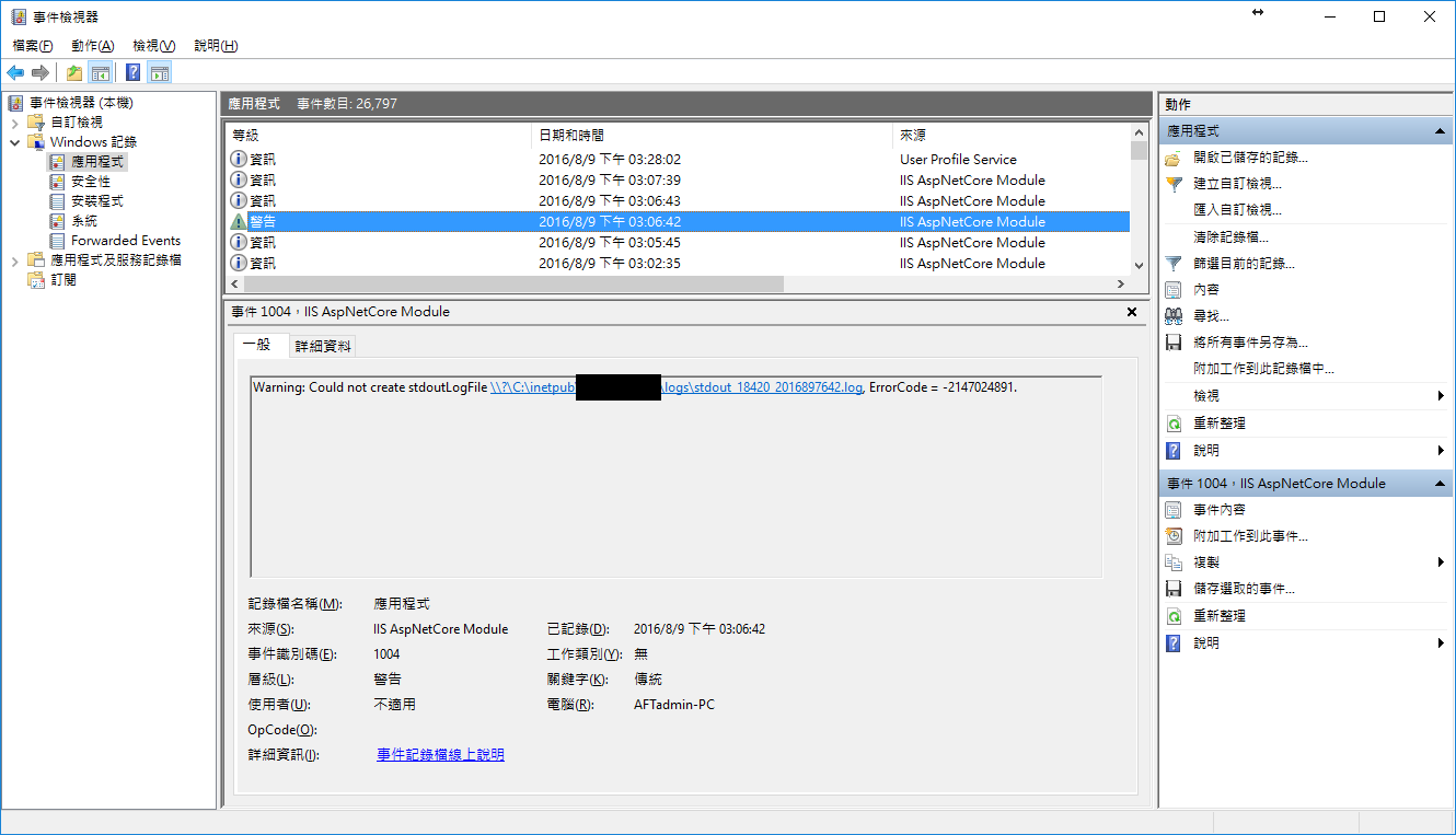 步驟 6. 開啟事件檢視器, 我們會發現沒有權限建立log檔案的訊息。