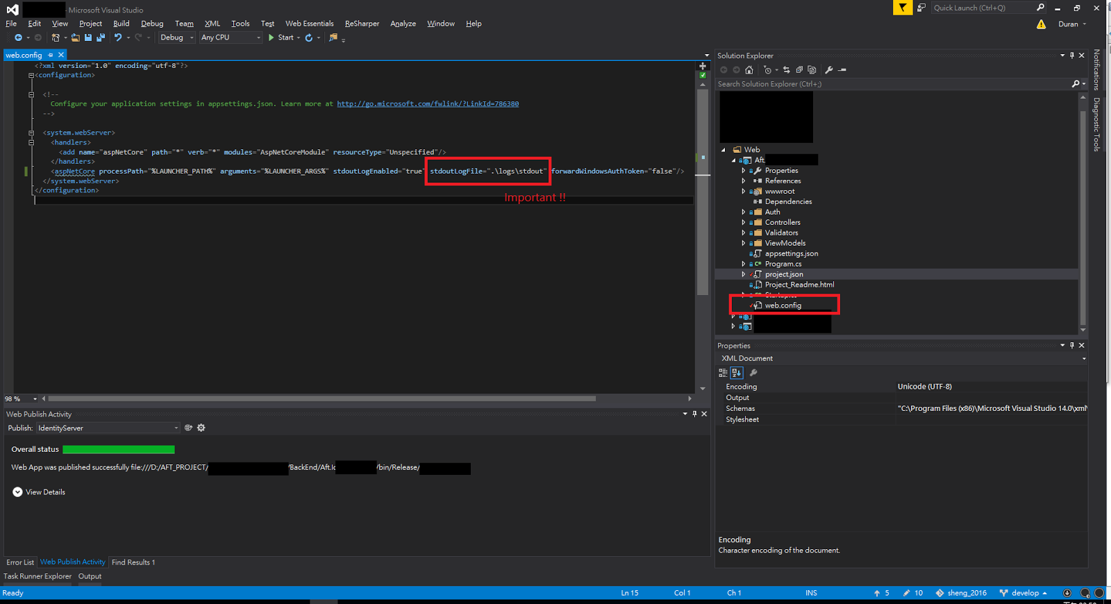 步驟 1. 確認專案內 web.config 內 stdoutLogFile 設定正確,預設為 ".\logs\stdout" (相對路徑)