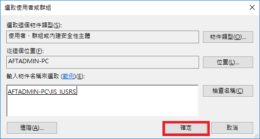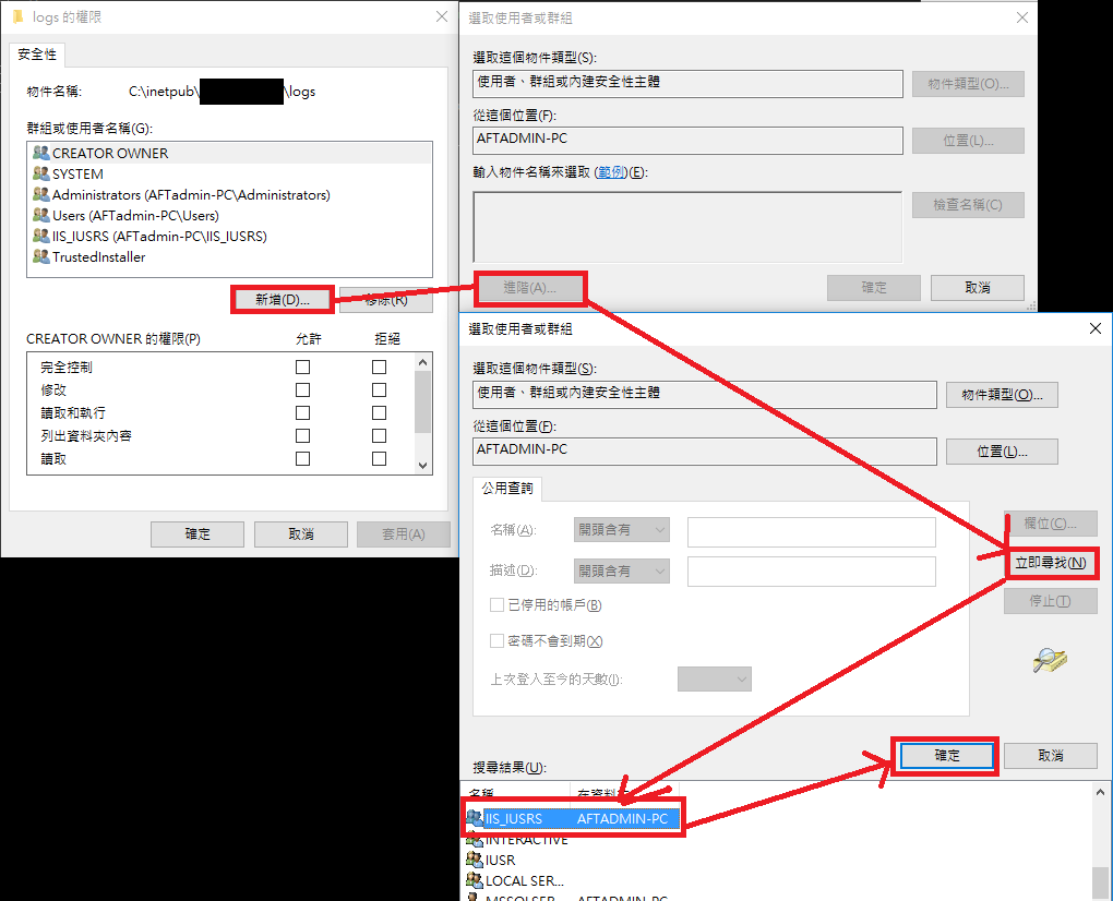 步驟 8. 點選新增 -> 進階 -> 立即尋找,選取IIS_IUSER,點選確定