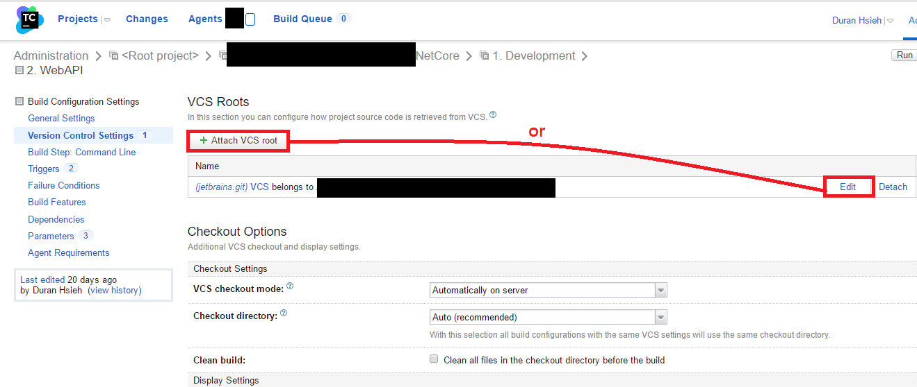 點選 attach VCS root 或 edit 進入設定畫面,主要輸入git url與帳號密碼,這裡不贅述。