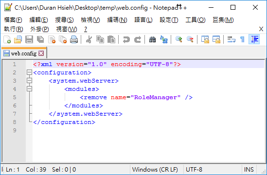 Step 4.在web.config 上可以看見移除模組 (從web.config編輯也有相同效果)