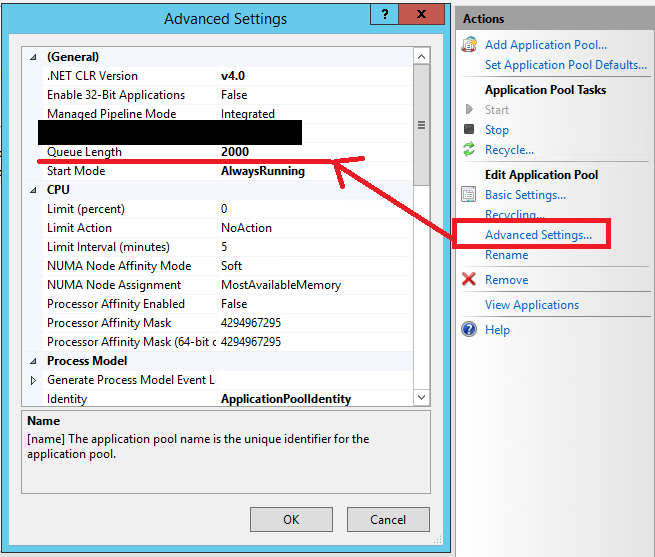 設定位置在 IIS 內 Application pools > Advanced Settings... > Queue length