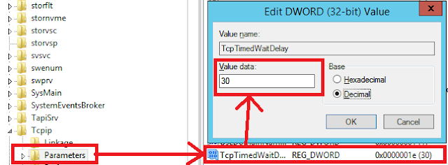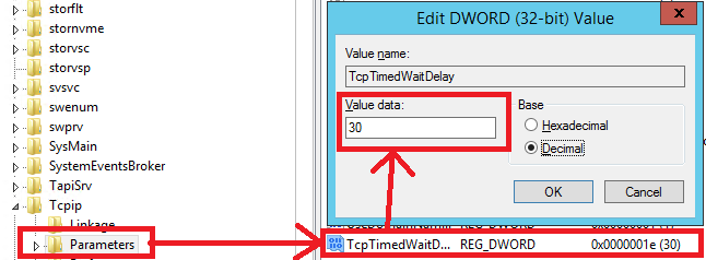 Step 2. TcpTimedWaitDelay 設定 Value 為 30,注意右邊要選擇 Decimal (10進位)