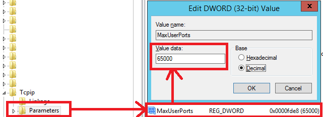 Step 3. MaxUserPorts 設定為 65000,注意右邊要選擇 Decimal (10進位)
