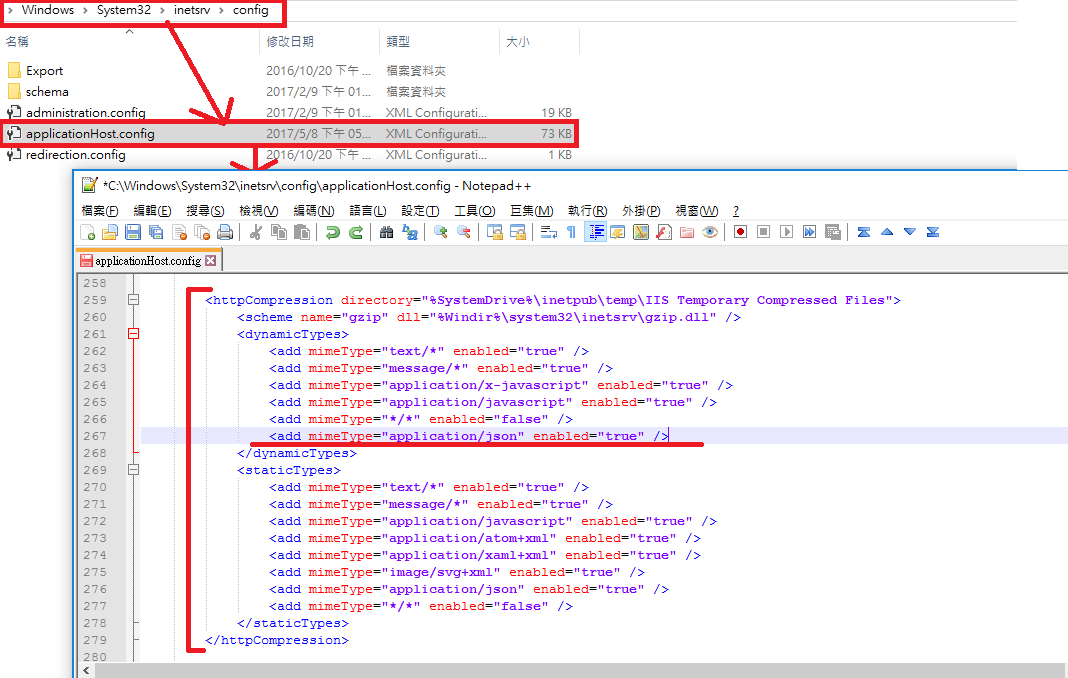 Step 3 壓縮設定:您可以在web.config內直接加入<httpcompression> 標籤並進行設定;您也可以設定在 ApplicationHost.config (位於 %windir%\System32\inetsrv\config),如下圖所示,因為我們 WebAPI 回傳為 json 格式的資料,故加入: