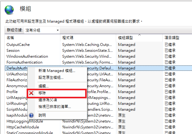 因為本身測試環境為WebAPI,可將許多IIS預設載入的模組進行移除。我們能在各別站台的Web.Config 檔案進行設定。在移除過程中請參考自己的網站/服務是否需要這些模組。