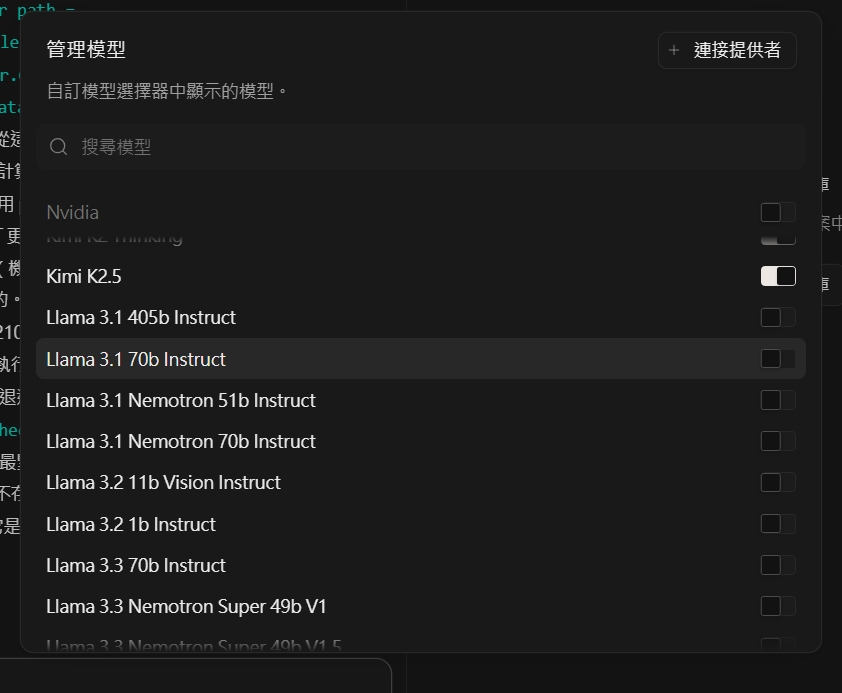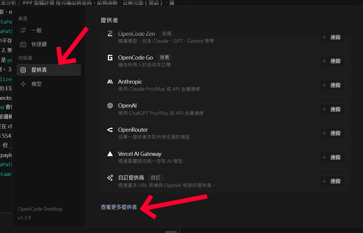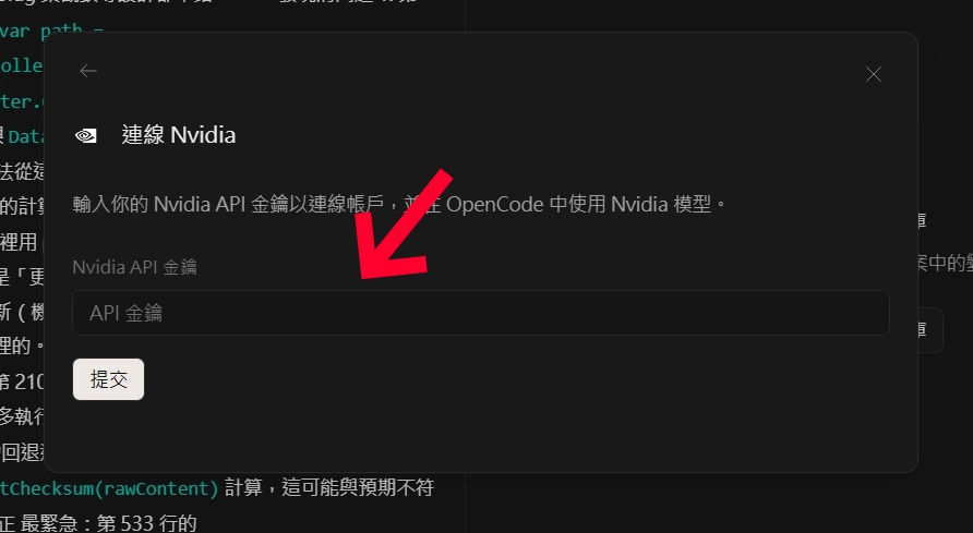3. 安裝好 opencode 之後,點選左下角的設定,並且選擇 提供者,查看更多提供者,選擇 NVIDIA 並且貼入第一步拿到的 Key