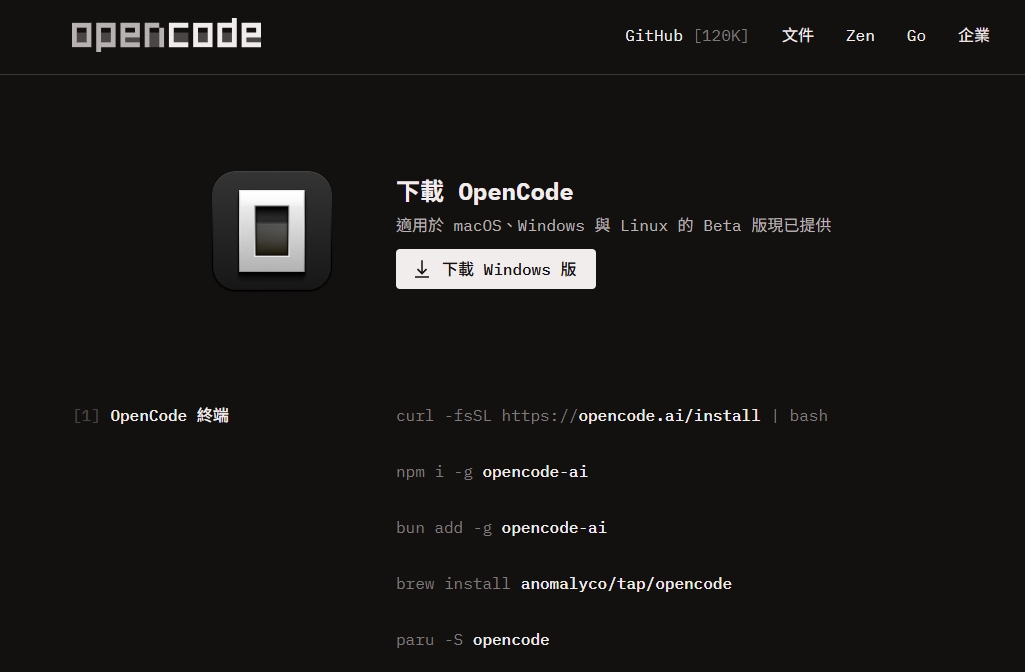 2. 透過這裡下載 opencode ,看你是哪個作業系統就下載哪個版本,我這邊測試的就是 Windows