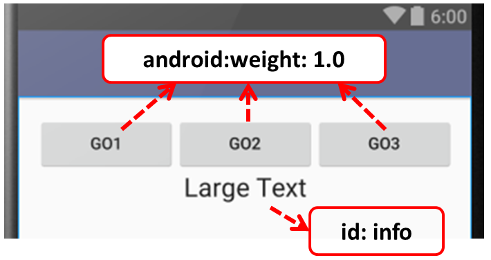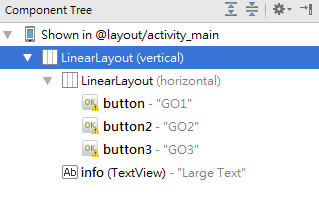 請將三個Button元件的權重屬性皆設定為1,再為TextView元件訂定id屬性為「info」,預覽與元件的屬性說明如下: