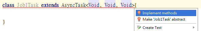 因繼承了AsyncTask的原因,必須實作doInBackground方法,在類別定義處(顯示紅色警告行)按下「Alt+Enter」使用快速解決方案「Implement methods」可快速實作方法,如下圖: