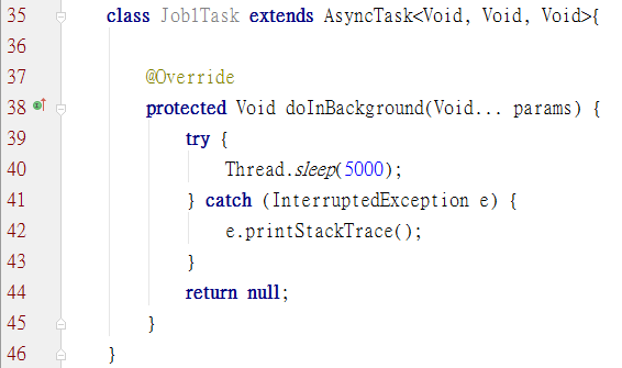 在doInBackground方法中使用Thread.sleep(5000)讓這個工作停頓五秒,記得必須以「try…catch」處理(可按下Alt+Enter快速解決),程式碼如下: