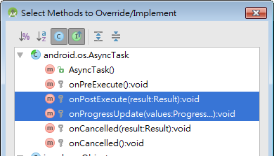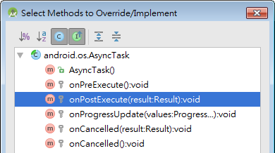 因為需求中描述的,五秒結束後需改變TextView中的文字,因此再覆寫onPostExecute方法,按下「Ctrl+O」覆寫方法快速鍵,選擇欲覆寫的方法,如下圖: