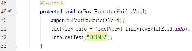 在覆寫方法時,應覆寫onPostExecute與onProgressUpdate兩個方法,如下: