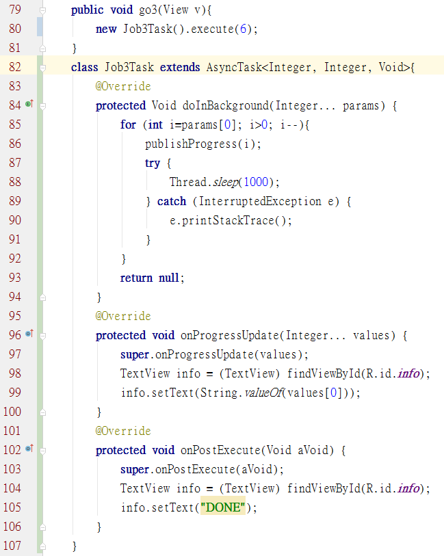 第85到92行使用for迴圈,由傳入值遞減到1,第88行每次迴圈執行即停頓1秒,重點在第86行,呼叫publishProgress方法,會自動呼叫第96行的onProgressUpdate方法,此方法負責每秒更新TextView中的文字。在第80行產生Job3Task並傳入6至類別中執行。