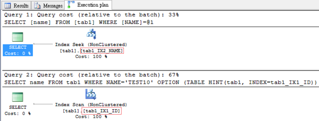 SELECT name FROM tab1 WHERE NAME='TEST10' OPTION (TABLE HINT(tab1, INDEX=tab1_IX1_ID))