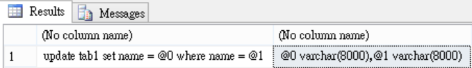 exec sp_executesql N'update tab1 set name = @0 where name = @1',N'@0 varchar(20),@1 varchar(20)' ,@0='TEST99_1',@1='TEST99'