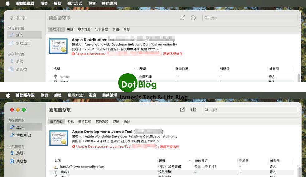如果根據 前篇 操作後有發現 macOS 所建立的憑證不受信任的話,請參考此篇處理。