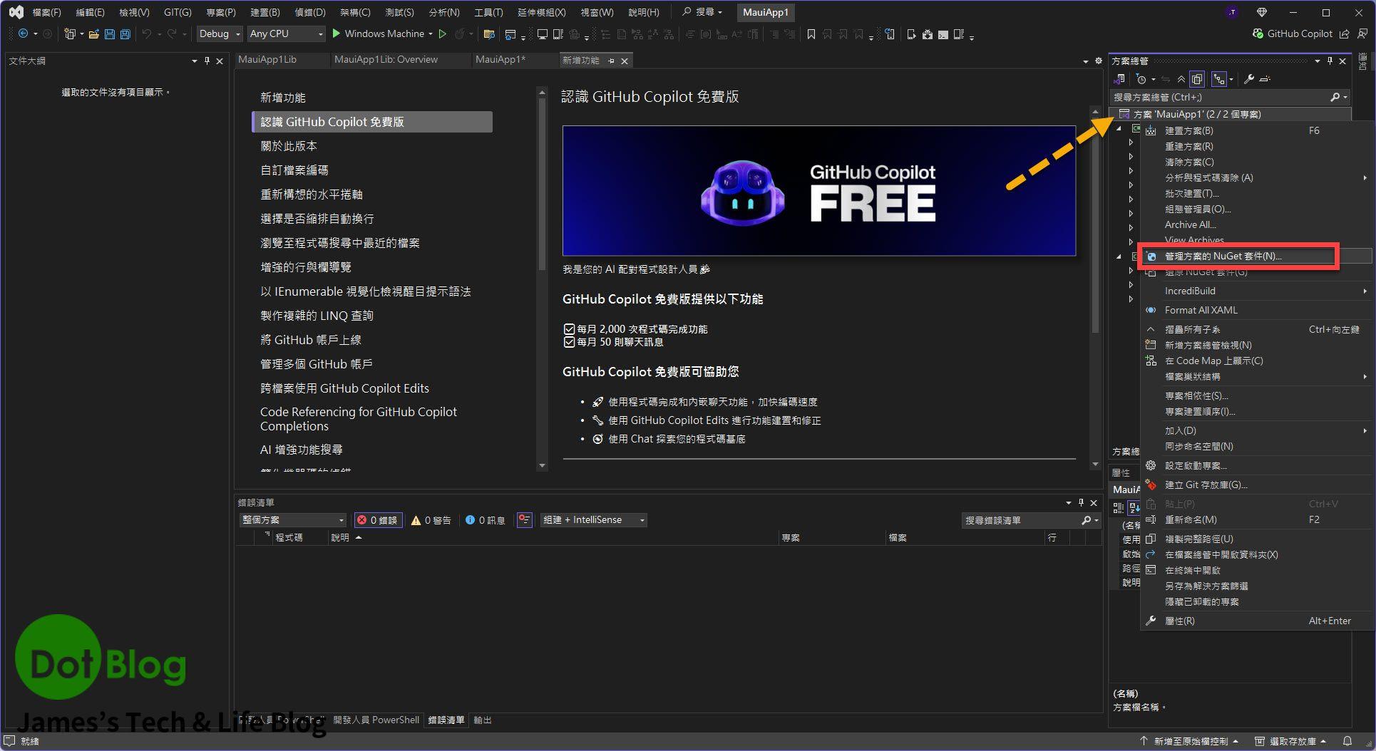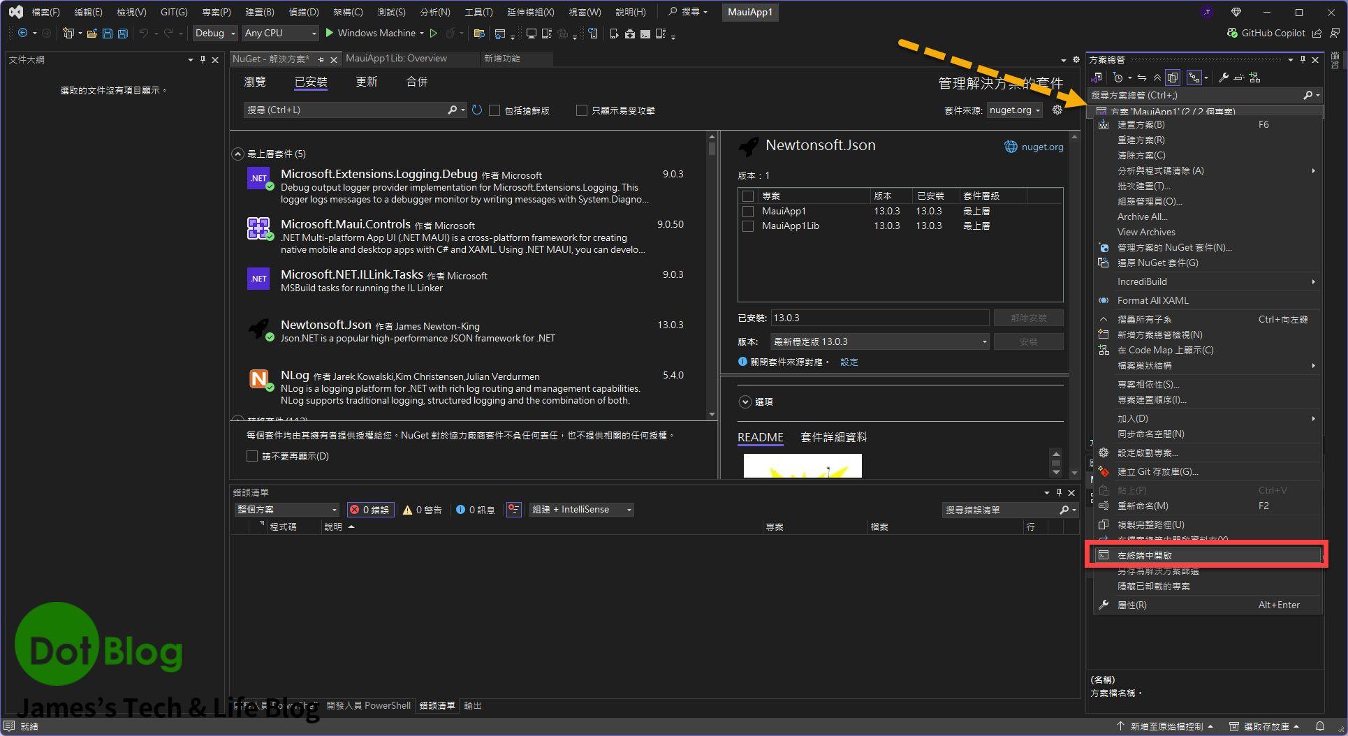 很多時候如果一個解決方案裡有多個專案共存,如果要更新 Nuget 套件的,可以透過 Visual Studio 當中的 "管理方案的 Nuget 套件":