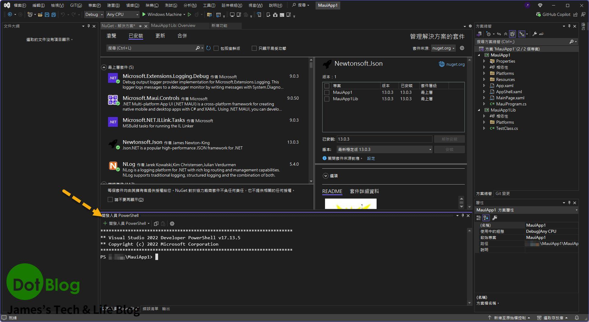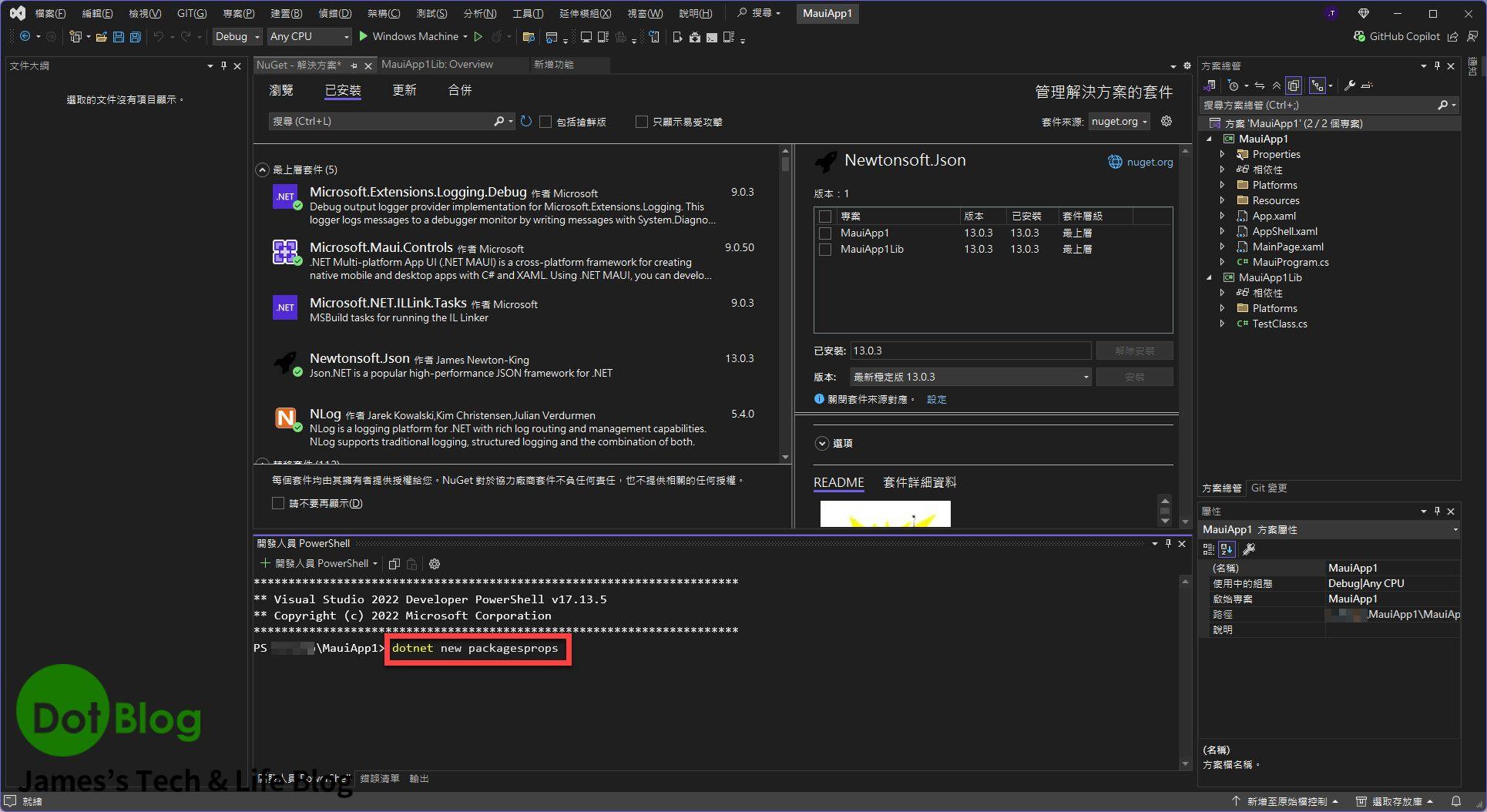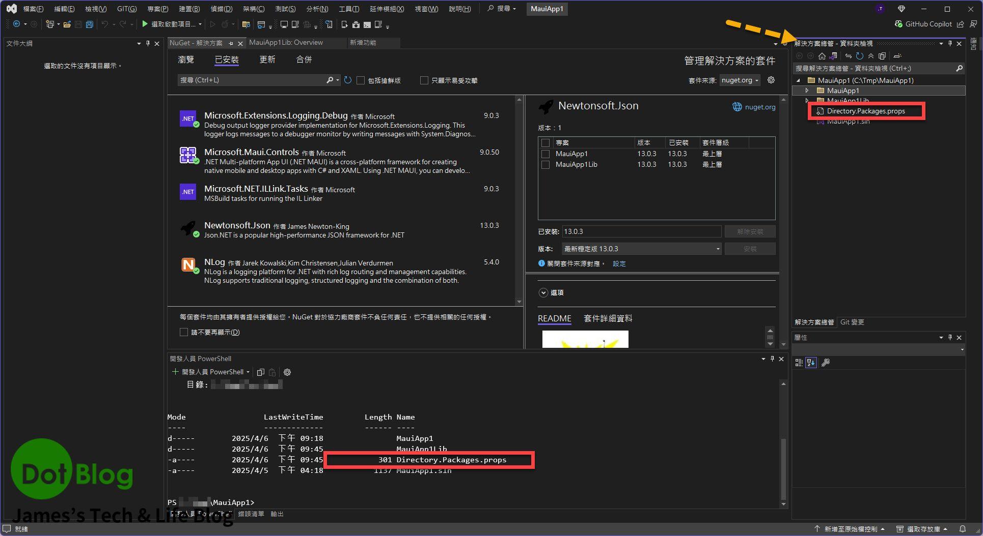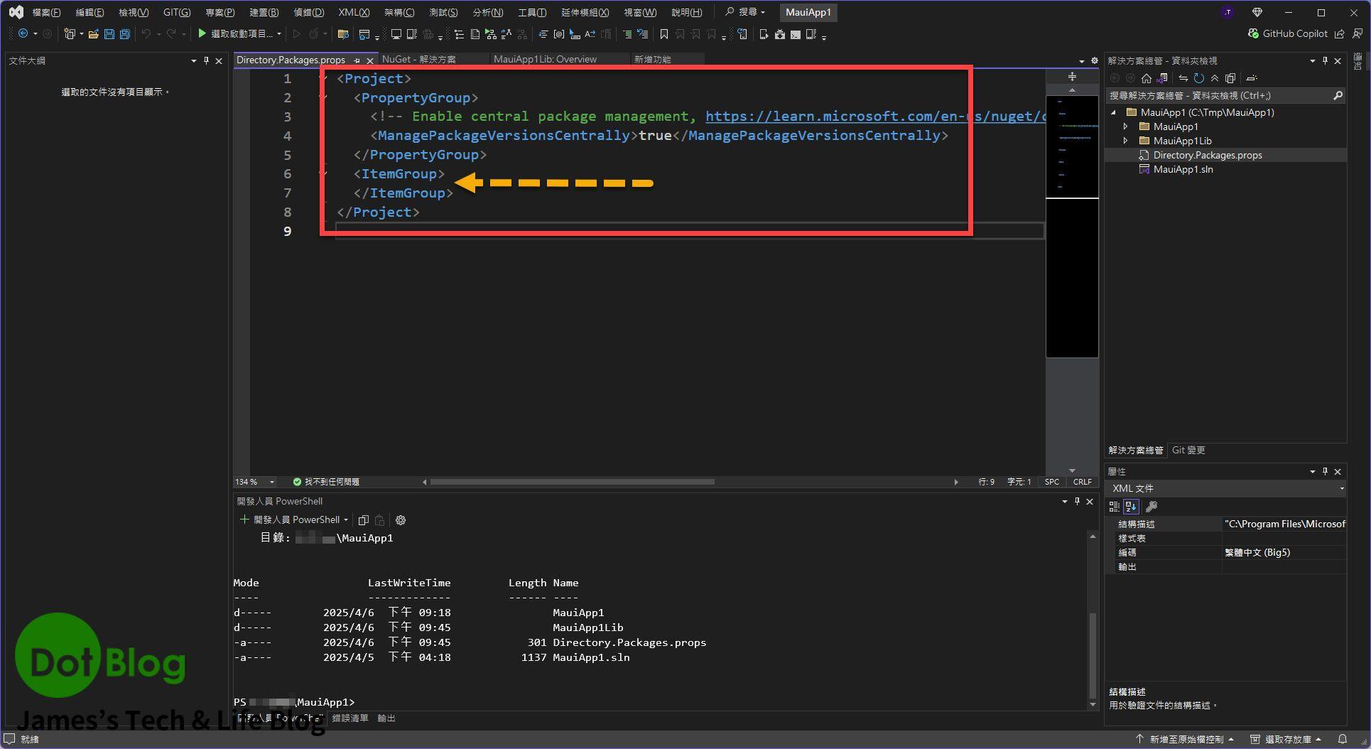 再透過 "ls" 或 "dir" 查詢,或是透過方案總管的 "資料夾檢視" 觀看是否有該 "Directory.Packages.props" 檔案出現: